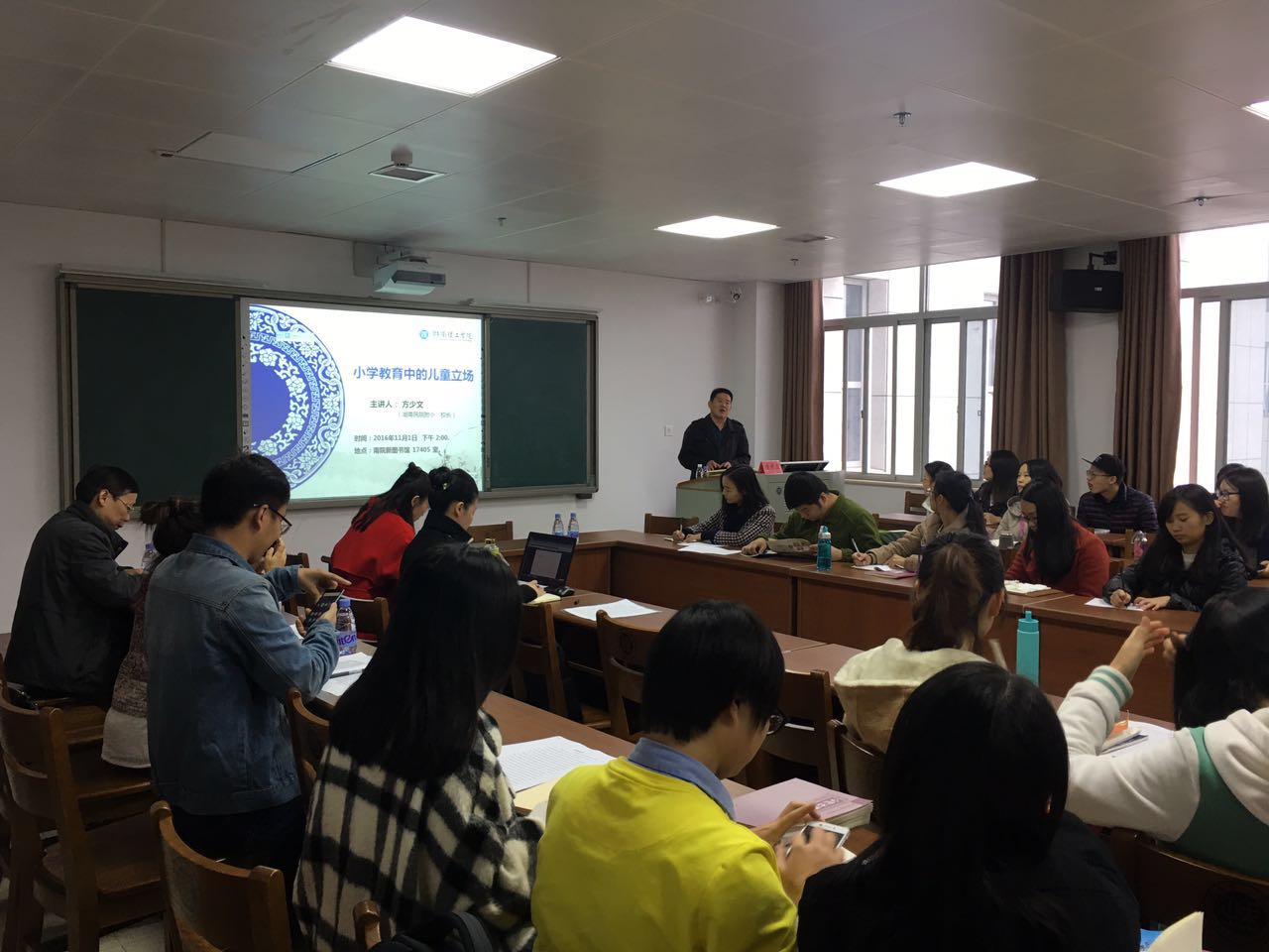11月1日下午,在公司新图书馆17405学术活动室,南湖小学(湖南民院附小)方少文董事长与beats365官方网站教育硕士以《小学教育中的儿童立场》作主题交流。交流活动由教育科学研究所刘理博士主持,2015级和2016级全体教育硕士参加。