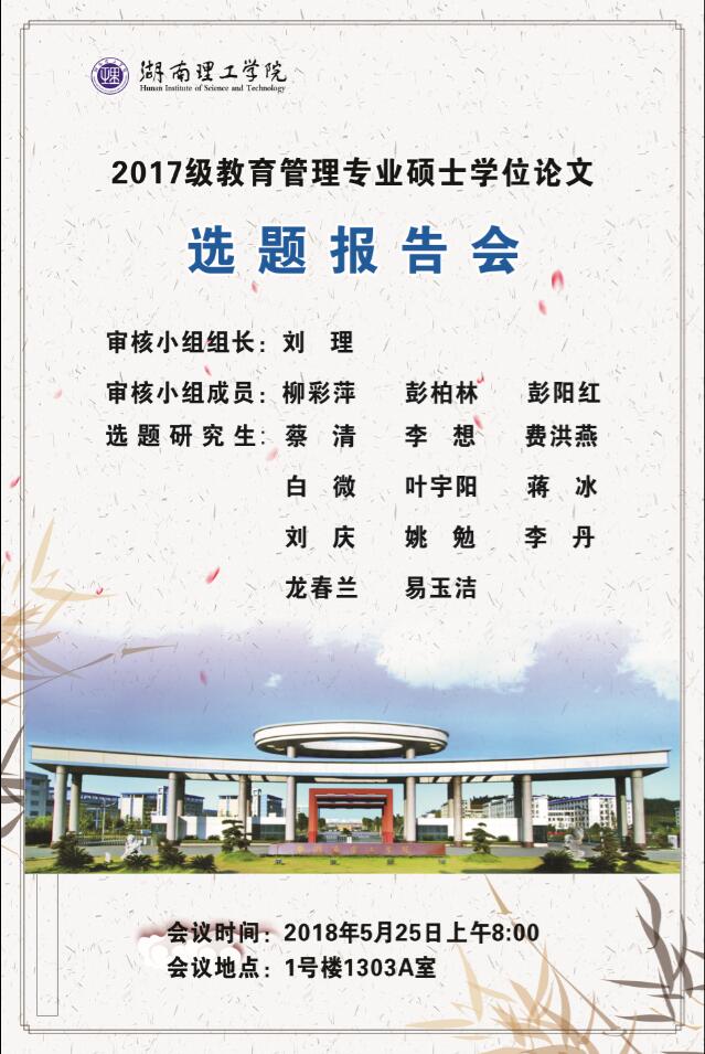 525下午,beats365官方网站2017级教育管理专业硕士研究生学位论文选题报告会在1303A举行。beats365官方网站副经理彭阳红副教授担任论文选题报告会专家组组长并主持报告会;岳阳市珍珠山公司董事长、正高级中学教师柳彩萍,beats365官方网站期刊社社长彭柏林教授担任专家组成员。公司硕士生导师代表以及2017级教育管理专业全体研究生参加本次报告会。