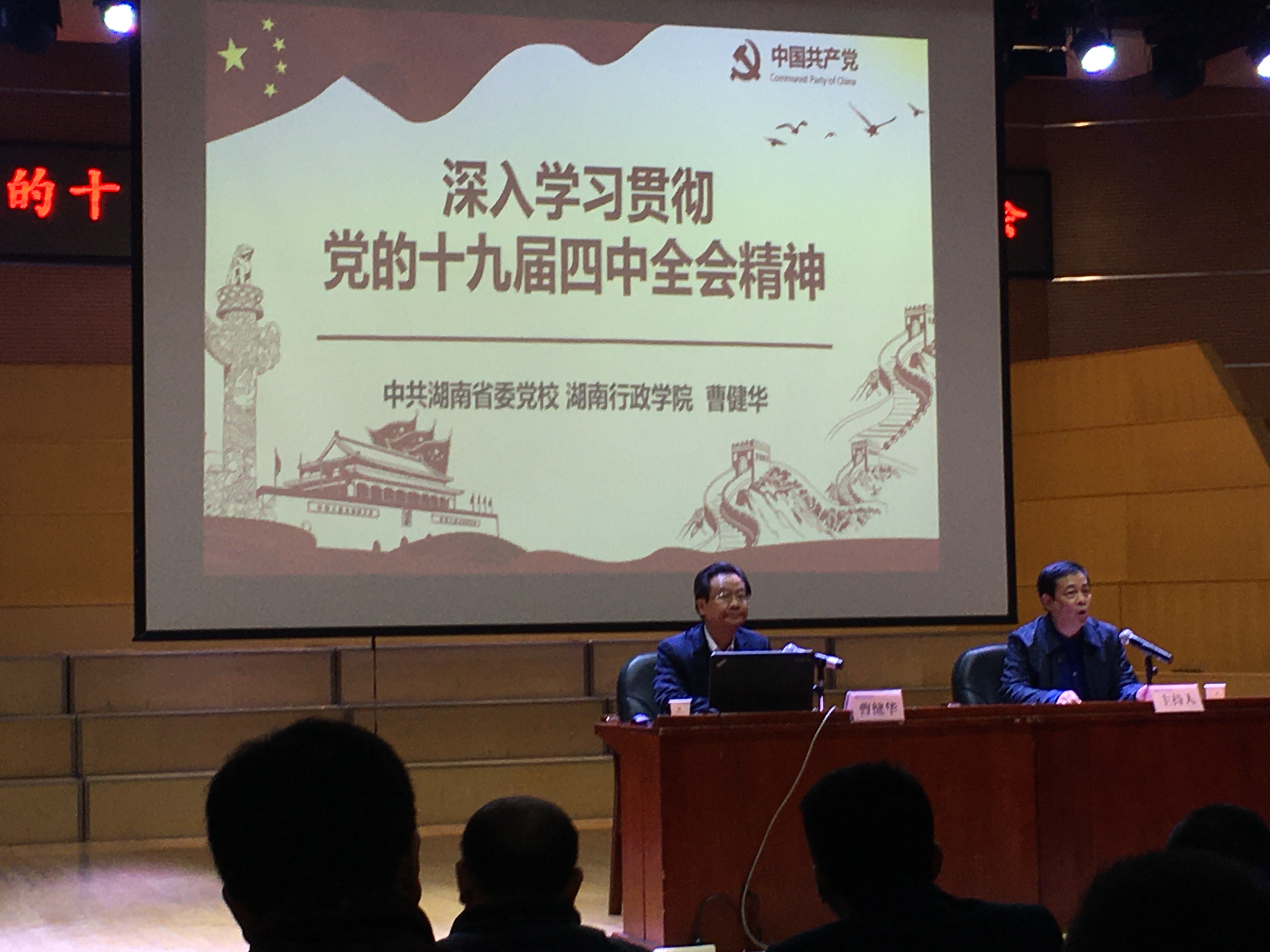 11月28日(星期四)下午3时30分,学习贯彻党的十九届四中全会精神省委宣讲团报告会在音乐厅举行。省委宣讲团成员、中共湖南省委党校湖南行政公司副校(院)长曹健华作宣讲报告。beats365官方网站刘理、刘淳松、彭阳红等班子成员及公司咨询专员王岳斌等参加学习。
