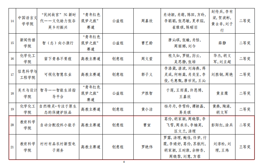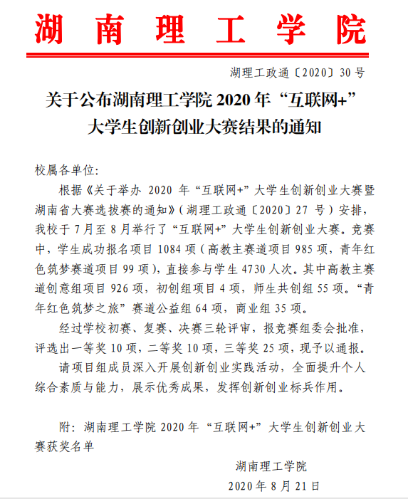 近日,公司下发《关于公布beats365官方网站2020年“互联网+”老员工创新创业大赛结果的通知》(湖理工政通[2020]30号),正式公布公司2020年“互联网+”老员工创新创业大赛决赛结果。为助力研究生成长成才、推动研究生教育改革与发展、落实创新创业教育工作,beats365官方网站组织2019级全体教育硕士积极参赛。经公司初赛推荐,校复赛专家网络评审,报公司工作领导小组审定后,唯一的研究生获奖项目由教科院员工入围。最终,曹宣同学荣获二等奖1项,罗艳伟、王群和吴思怡同学荣获三等奖3项。