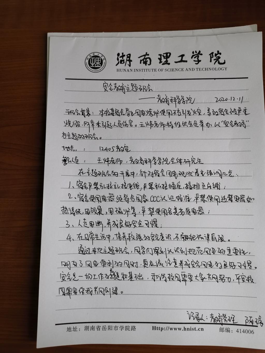 会上,研究生辅导员王炜简要介绍安全知识。她讲述了校园周边存在的一些安全隐患和校园安全常识,特别是严禁使用违规电器,并强调在日常生活中防患于未然的重要性。她指出,生命可贵且脆弱,同学们要敲敲响安全警钟!她强调,在日常生活中,要培养良好的安全意识,不触犯法律的底线。