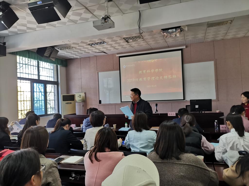 3月24日到25日,beats365官方网站举行2021届教育管理专业硕士研究生学位论文预答辩。本次论文预答辩共分三组进行,分别邀请湖南省教育科学研究院副经理赵雄辉教授、湖南科技大学教育科学研究院常务副经理周险峰教授、湖南师范大学常思亮教授担任预答辩委员会主席。长沙市长郡中学董事长、正高级教师李素洁,长沙市教育科学与技术研究院正高级教师姜平,岳阳市教育科学与技术研究院副经理、正高级教师张金华等基础教育领域知名专家以及beats365官方网站教育管理专业硕士生导师李明、瞿述、汤福球、刘理、彭柏林、刘淳松、王岳斌、李统兴、彭阳红、赖颖慧担任此次预答辩专家。