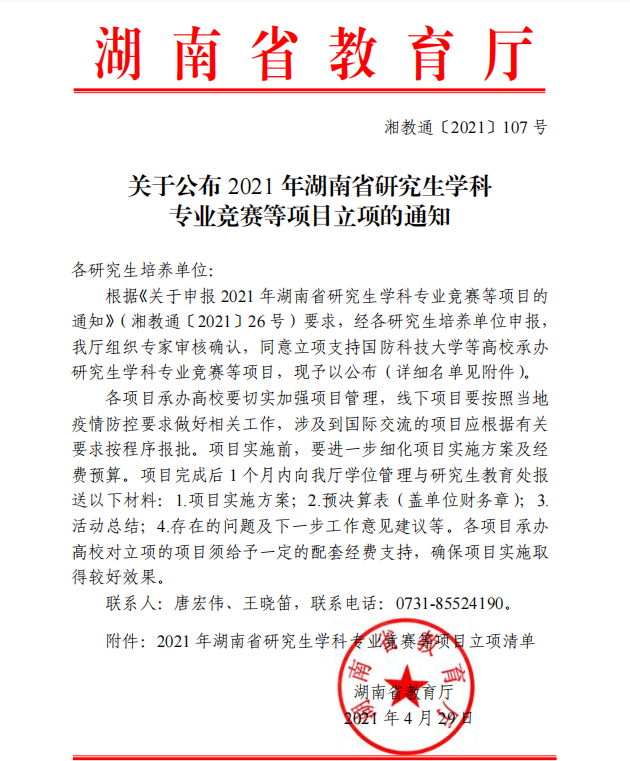 近日,湖南省教育厅公布2021年湖南省研究生学科专业竞赛等项目立项名单,由公司刘理教授主持申报的项目“教育高质量发展与教育评价改革”获批湖南省研究生“暑期公司”立项。