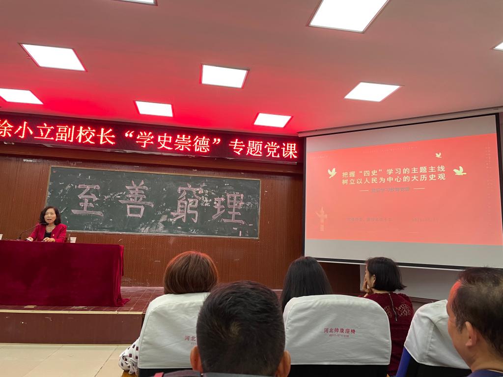 徐小立以《把握“四史”学习的主题主线、树立以人民为中心的大历史观》为题,结合自身党史学习体会从以下四个方面展开讲述:党史学习的主题主线;“四史”学习的侧重点;从改革开放史看“以人民为中心”的大历史观;“学史力行”——我们怎么办。讲课过程中,徐小立详细分析并阐述了如下党史学习要点:从中国共产党的奋斗史角度论述我们党团结带领全国各族人民如何浴血奋战,建立新中国,使中国人民终于站起来的历史;我们党如何解放思想、实事求是,开启改革开放新征程,使中国人民开始富起来的历史;我们党如何将马克思主义基本原理与中国的具体实际相结合,走上中国特色社会主义道路,使中华民族重新强起来的历史。她对中共党史、新中国史、改革开放史、社会主义发展史的学习侧重点作了详细讲解。接着她从改革开放史看“以人民为中心的大历史观”谈到必须坚持和完善中国共产党的领导、必须坚持走中国特色社会主义道路、必须坚持以人民为中心。最后她讲到学史力行,我们要坚定理想信念、增强政治“三力”、提振精气神、努力办实事,向党和人民递交一份满意答卷,以优异成绩向党的百年诞辰献礼。
