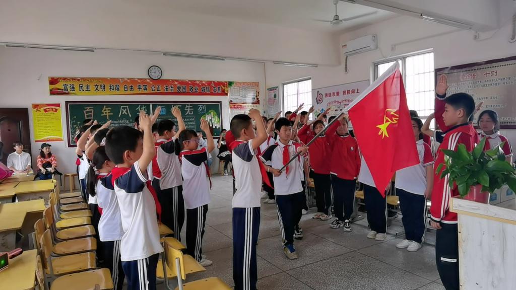 第三个环节是少先队员们集体列队、整队、报告、出旗、唱队歌,完成入队仪式。然后正式进入“心中有榜样,少年有力量”的班队交流活动。少先队中队长主持并组织少先队员们观看视频,感受人民的“战疫”英雄的伟大;通过讲述“榜样在我们身边——余书记的故事”,向书记表达敬意。通过本节少先队活动课的开展,相信队员们心中播下正能量的种子,也进一步体会了少先队的仪式感和荣誉感。致敬,时代的英雄;致敬,每一位学榜样、做榜样的少先队员!