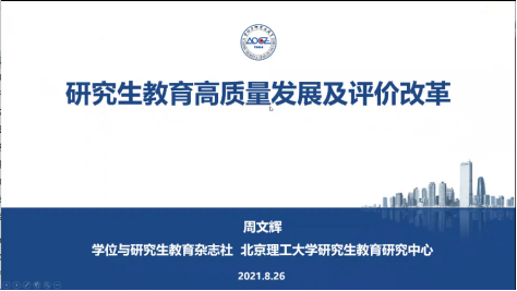 2021年8月26日下午4时,北京理工大学周文辉教授为2021年湖南省研究生暑期公司的学员作报告,题目是《研究生教育高质量发展及评价改革》。内容包括:“2013年至今的我国研究生教育”,“研究生教育发展现状:数据”,“公司产品质量保障机制”,“研究生教育评估现状”与“研究生教育评价改革”五个方面。
