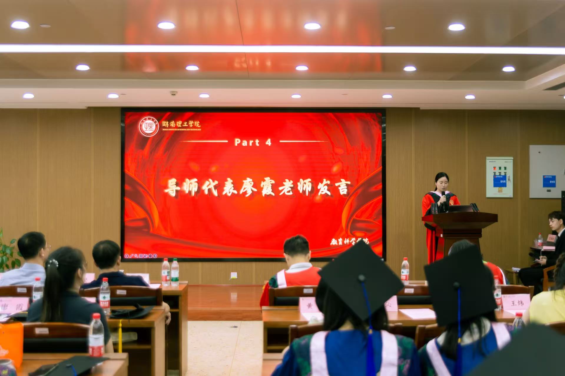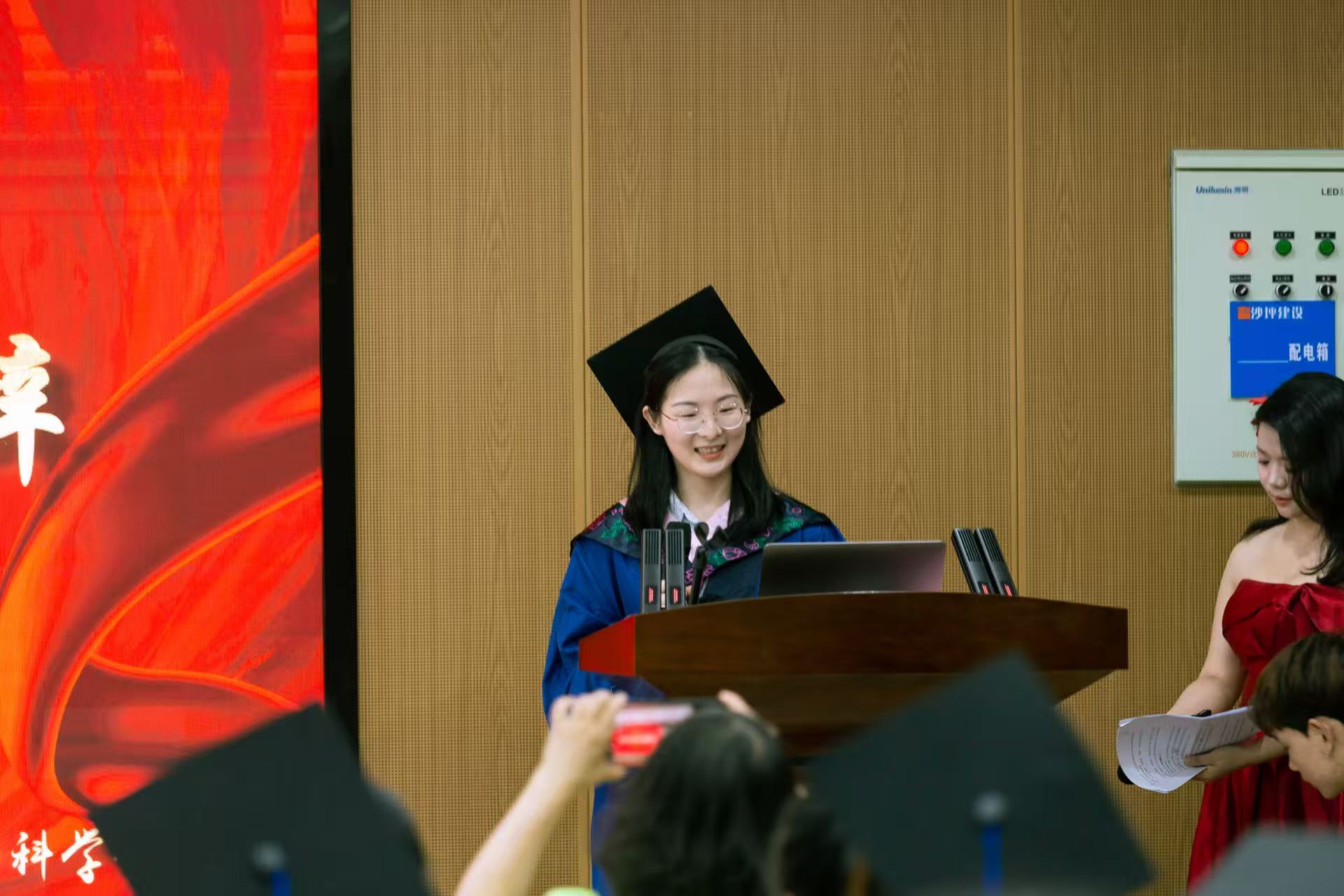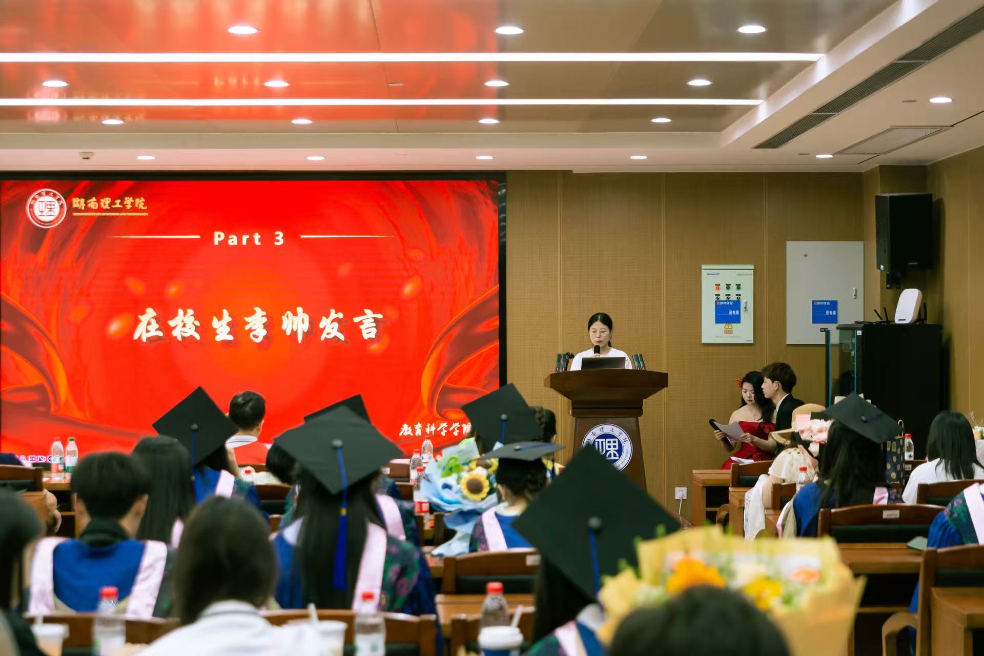 典礼伊始,播放了包含毕业生们两年学习、生活中精彩瞬间的视频。随后毕业生代表李思情进行发言,表达了对母校的感恩,对导师悉心栽培的感谢;在校生代表李帅在发言中为学长学姐送上了真挚的祝福;导师代表廖霞的发言则饱含对毕业生们的不舍与期许,叮嘱大家要坚守初心、终身学习。