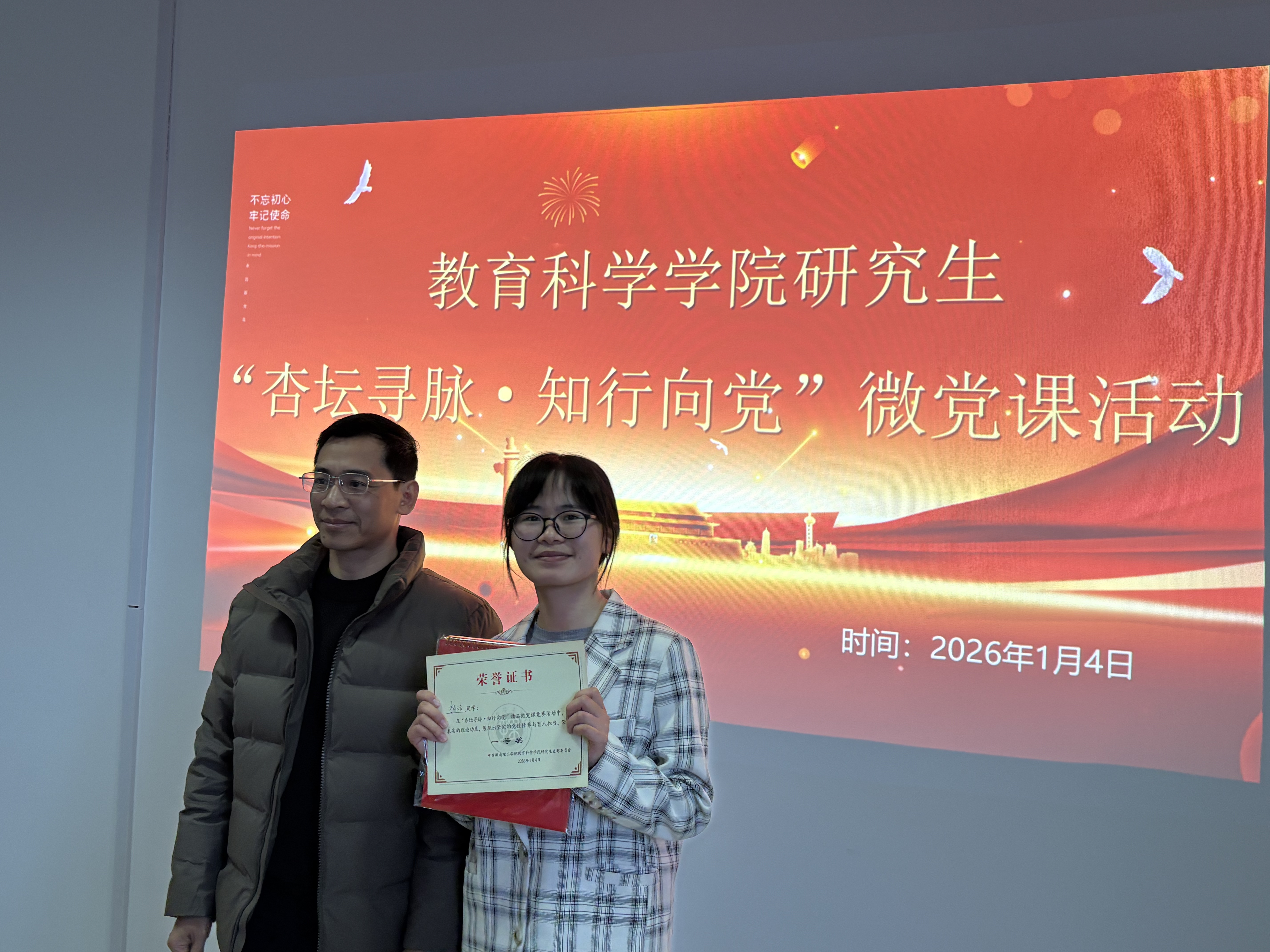 钟坚对活动成功举办及获奖同学表示祝贺。他强调,“杏坛寻脉”寻的是教育初心与红色基因,“知行向党”行的是为党育人、为国育才的实践使命,本次微党课既是深刻的理论学习,更是有效的党性锻炼。更是寄语全体研究生党员,要将学习热情转化为深耕专业、服务教育的持久动力,成长为政治坚定、业务精湛的新时代教育人才。