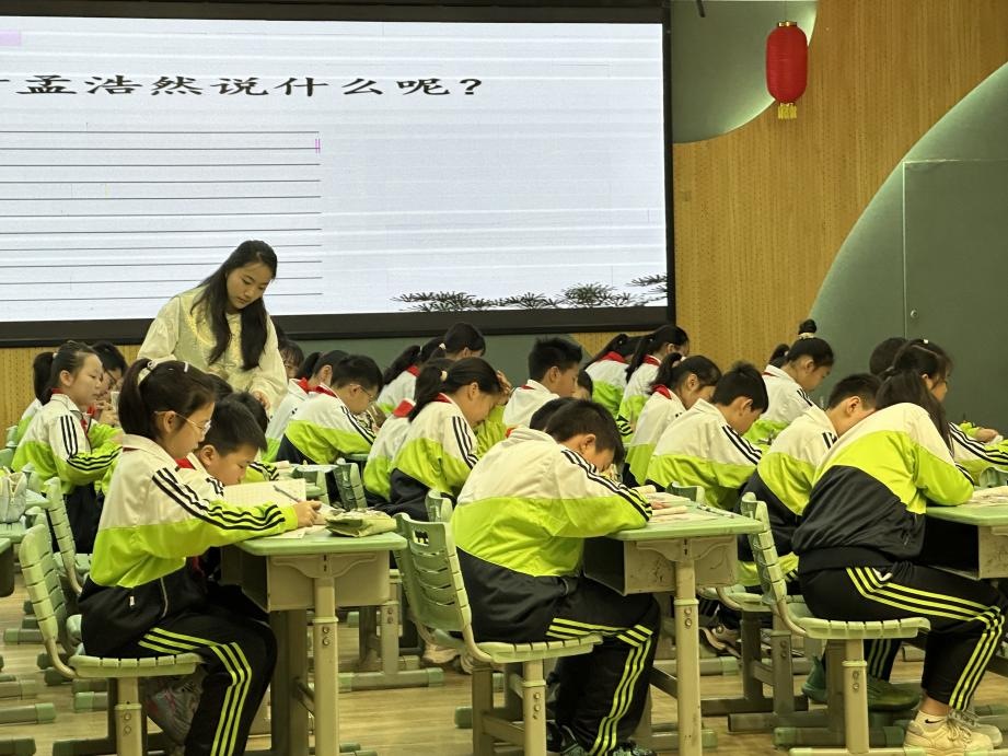 活动伊始,北港小学书记刘小平在致辞时以范仲淹“先天下之忧而忧”精神为引,强调传统文化教育需“培根铸魂,启智润心”。随后三节示范课各具特色:朱怡晖老师执教《闻官军收河南河北》,以“喜”字为主线,通过情境创设带领员工体悟杜甫的忧乐精神和家国情怀;研究生王芙芳以吟诵情境视频等形式演绎《送孟浩然之广陵》,展现李白的诗意别情;李统兴教授则以《古诗里的儿童》为专题,通过吟诵、小组讨论等互动形式,引导员工在六首古诗中感受自然之美与童年之趣,激发对古今儿童生活的思考。