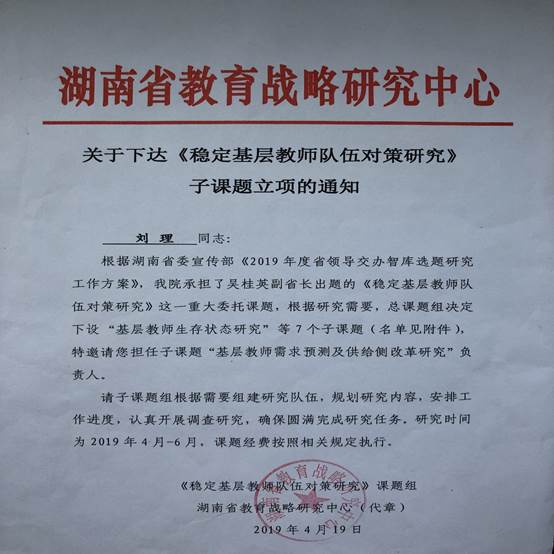 近日,湖南省教育发展战略中心发来函件,委托公司经理刘理教授承担《基层教师需求预测及供给侧改革研究》课题,该课题系由湖南省教育发展战略中心承担的吴挂英副省长出题的《稳定基层教师队伍对策研究》重大委托课题子课题。(刘青姗)