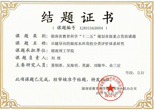 近日,湖南省教育科学规划课题本科院校2019年第三季度结题情况公布,由公司刘理教授主持的省级重点资助课题《卓越导向的湖南本科高校分类评价体系研究》(编号XJK013AGD004)高水平通过结题,等级为“良好”。在此次全省结题的163个项目中,是唯一等级为良好的项目,其余均为合格。(撰稿 刘青姗)