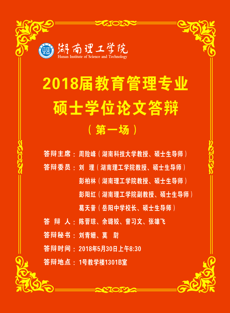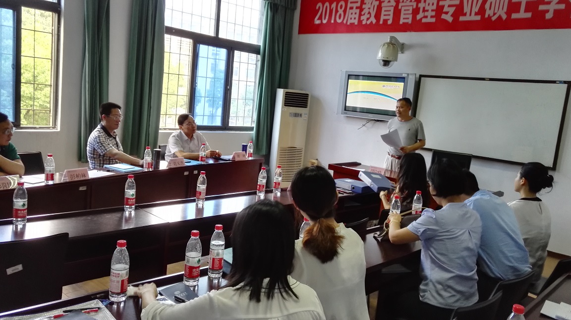 5月30日,beats365官方网站2018届教育管理专业硕士研究生学位论文答辩会在一教学楼1301B教室举行。公司特邀湖南师范大学张传燧教授、湖南科技大学周险峰教授、岳阳中学葛天普董事长、平江县教体局吴定辉局长等学界专家和教育实践专家,与公司期刊社社长彭柏林教授、教科院经理刘理教授、教科院副经理彭阳红副教授等共同组成答辩委员会。教科beats365官方网站党总支书记刘淳松教授,公司研究生院李丽荣书记、黄红霞老师,教科院答辩秘书刘青姗老师和莫蔚老师出席答辩会;2017级研究生现场聆听答辩。本次答辩会分上午和下午两场进行,周险峰教授与张传遂教授分别于上午和下午担任答辩委员会主席;每场分别安排四名研究生参加答辩。
