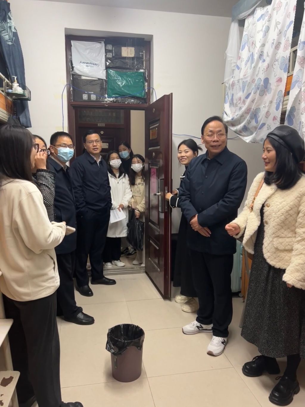 走进寝室,公司领导热情地与同学们打招呼,并亲切交谈,详细询问同学们生活、学习情况,了解同学们的思想动态,耐心解答同学们的各类困惑。公司领导表示:同学们在学习生活中遇到了任何困难,都可以及时向老师寻求帮助。公司领导嘱咐同学们合理安排作息时间,提高身体素质,保持宿舍卫生,做好个人防护,以积极的心态和良好的精神面貌迎接接下来的学习和生活。与此同时,公司领导给同学们派发了口罩、酒精等防疫物资。 (撰稿:欧阳瑾霓 摄影:甘鑫垚;一审:王炜;二审:隋幸华;三审:刘淳松)
