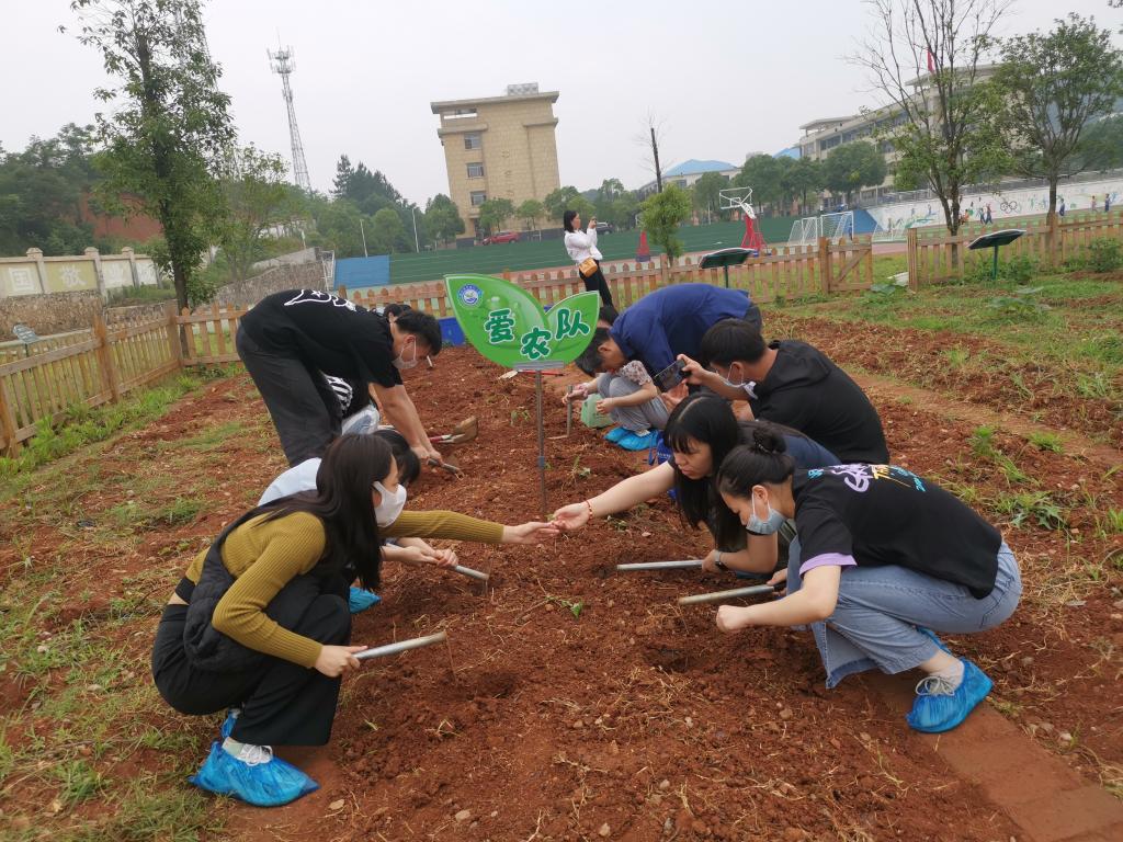 随后,朱岳云老师带领大家一起参观了郭兴小学的劳动实践基地——勉农园,让大家亲自体验郭兴小学的员工们的日常劳动。微风不燥,阳光正好,朱岳云老师交代了种植的注意事项和规范操作,强调不能浪费苗子的同时要更大化的利用土地。随后教科院的师生们纷纷拿起工具,捋起袖子认真干,先将田地里的杂草清理干净,然后将凹凸不平的地块刨平,随后开穴深挖,进行紫苏、鱼腥草等植物的移栽。苗放好后,用土覆盖,踩实,使苗与土充分接触。很快,在教科院师生的共同努力下,大家已经种植了一块地,每个人的脸上都扬起了满足的微笑。