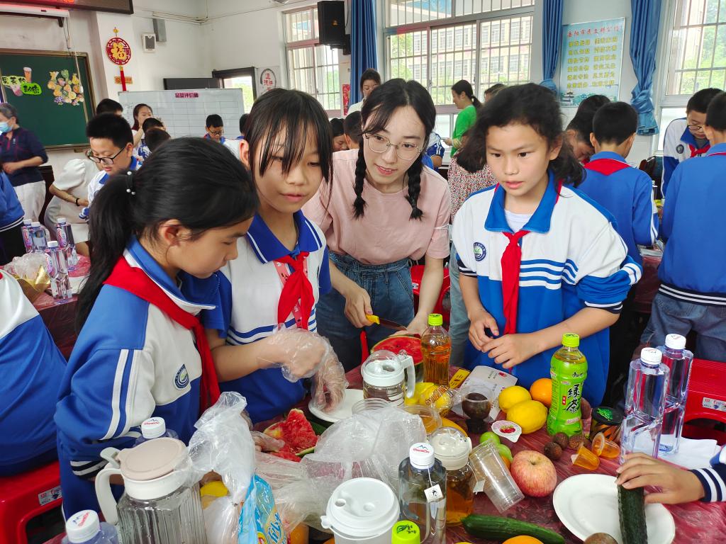 第二环节,易娟老师带领郭兴小学20班的同学给我们上了一节沉浸式的果茶观摩课。易娟老师以《果茶的秘密》为主题进行果茶教学,20班的同学分成6个小组自行准备了一系列的水果茶包,教科院小学教育研究生作为第7小组也参与了果茶制作与学习。
