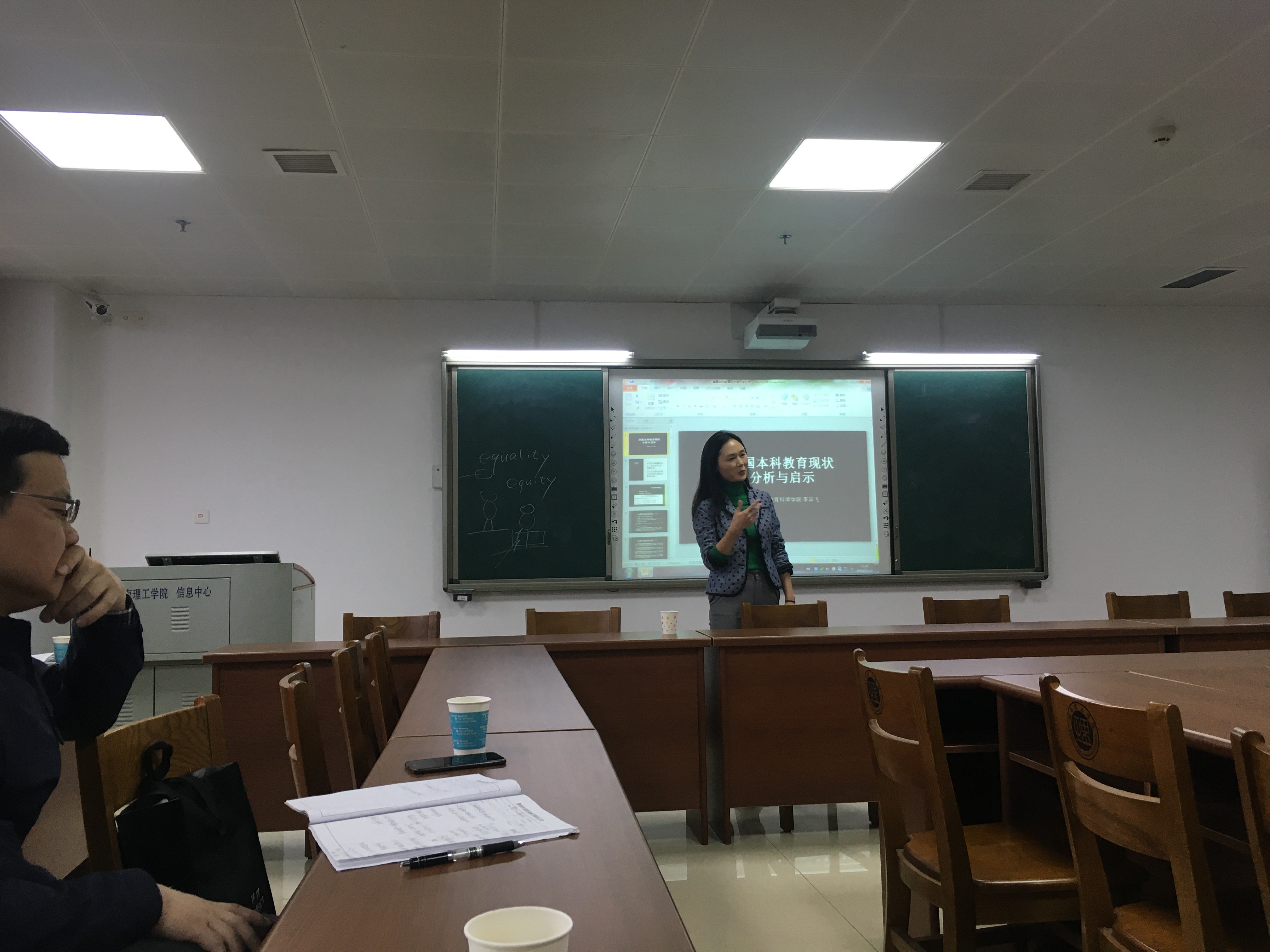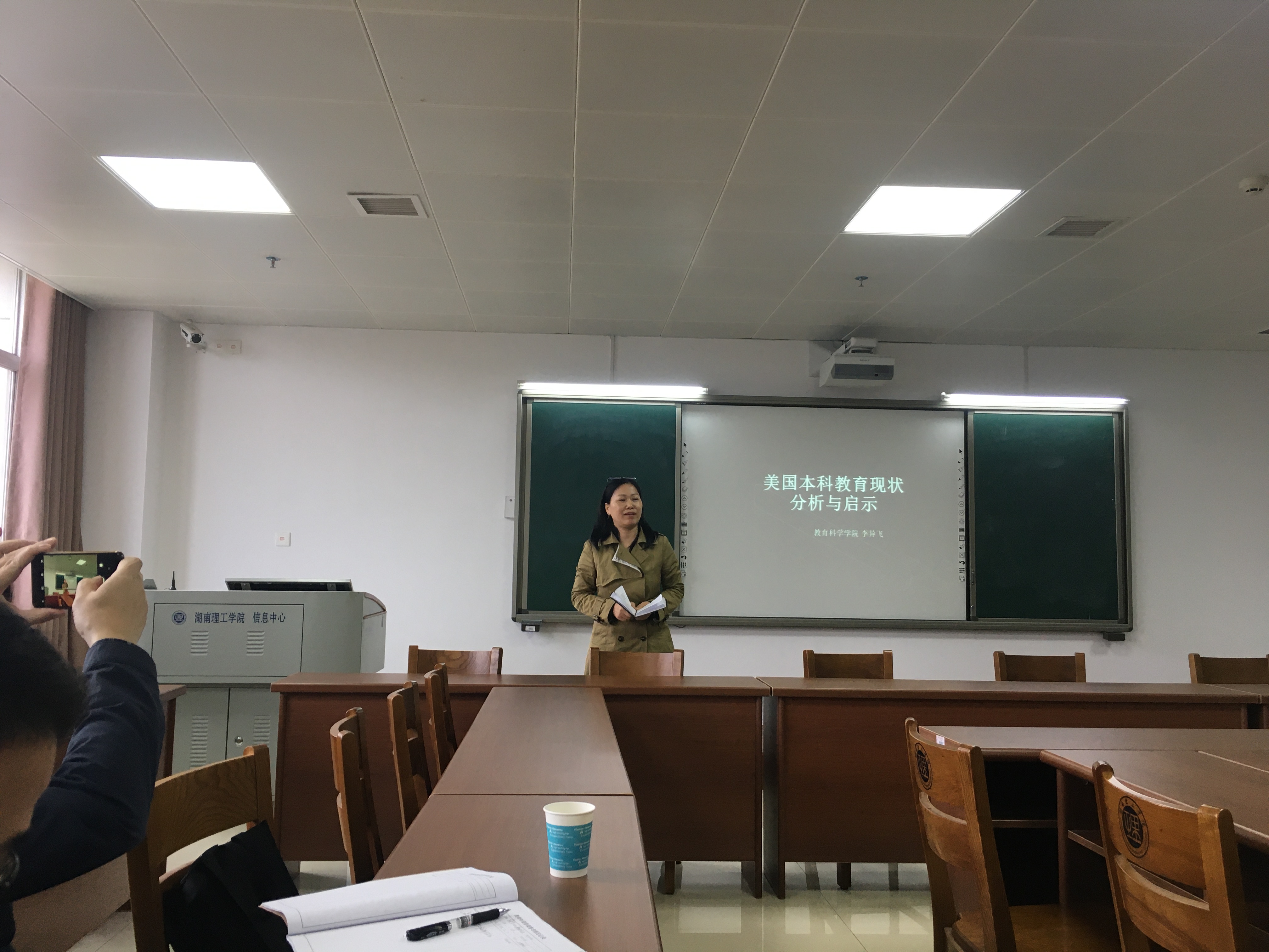 首先,教科院李异飞博士作题为“美国本科教育现状分析与启示”的报告。她以自己多年的美国高校教学的经历和体会,从“课程教学——以美国《教育学导论》课程为例”、“以学习成果为导向的美国本科教育测量与评估”等两方面对美国博林格林州立大学教师教育的课程教学和教育测量与评估作介绍。同时,她对上述内容阐述了自己的心得与看法。李老师的报告持续80分钟,听众一直在认真地听。随后,与会老师展开讨论。老师们从教学实践环节的实施、课程教学内容的编排以及师生之间交流等内容作深入讨论。讨论结束之后,教研室主任洪冬美副教授做活动小结。最后,公司教师发展中心王莉英副主任讲话,他鼓励全体新进教师钻研教学、不断提高教学质量。