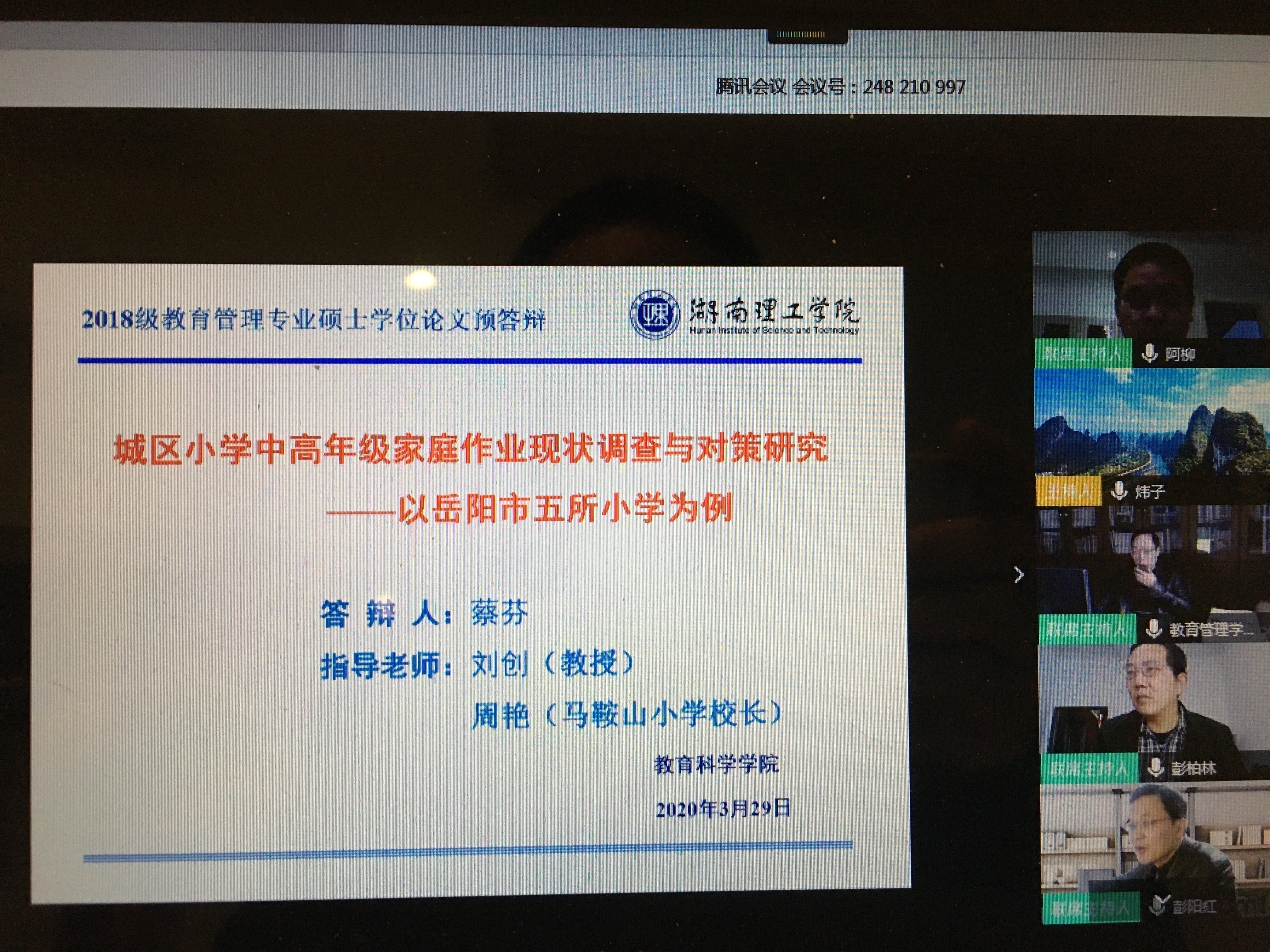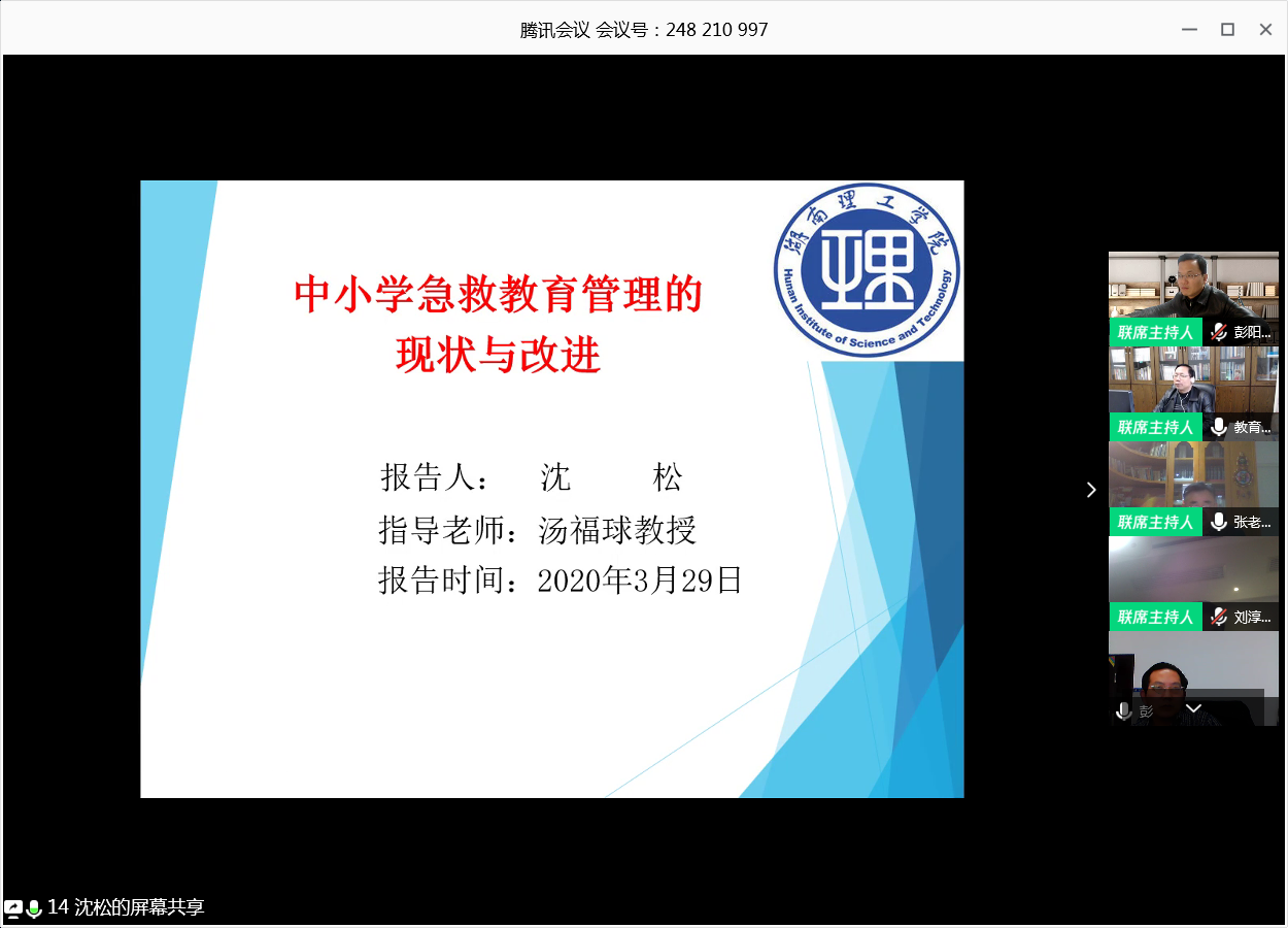 329日,beats365官方网站通过腾讯会议APP以视频连线方式举行2020届教育管理专业硕士研究生学位论文“云端”预答辩。教育管理专业研究生导师、beats365官方网站党委书记李明云端在线指导答辩。答辩专家委员会由教科院经理刘理、期刊社社长彭柏林、教科beats365官方网站党总支书记刘淳松、岳阳市教育科学与技术研究院中小学正高级教师张金华、教科院副经理彭阳红组成。研究生beats365官方网站党总支书记李丽荣、研究生导师代表王岳斌、研究生院老师黄红霞等在线观摩、指导。答辩秘书王炜利用视频系统进行全程录像录音。