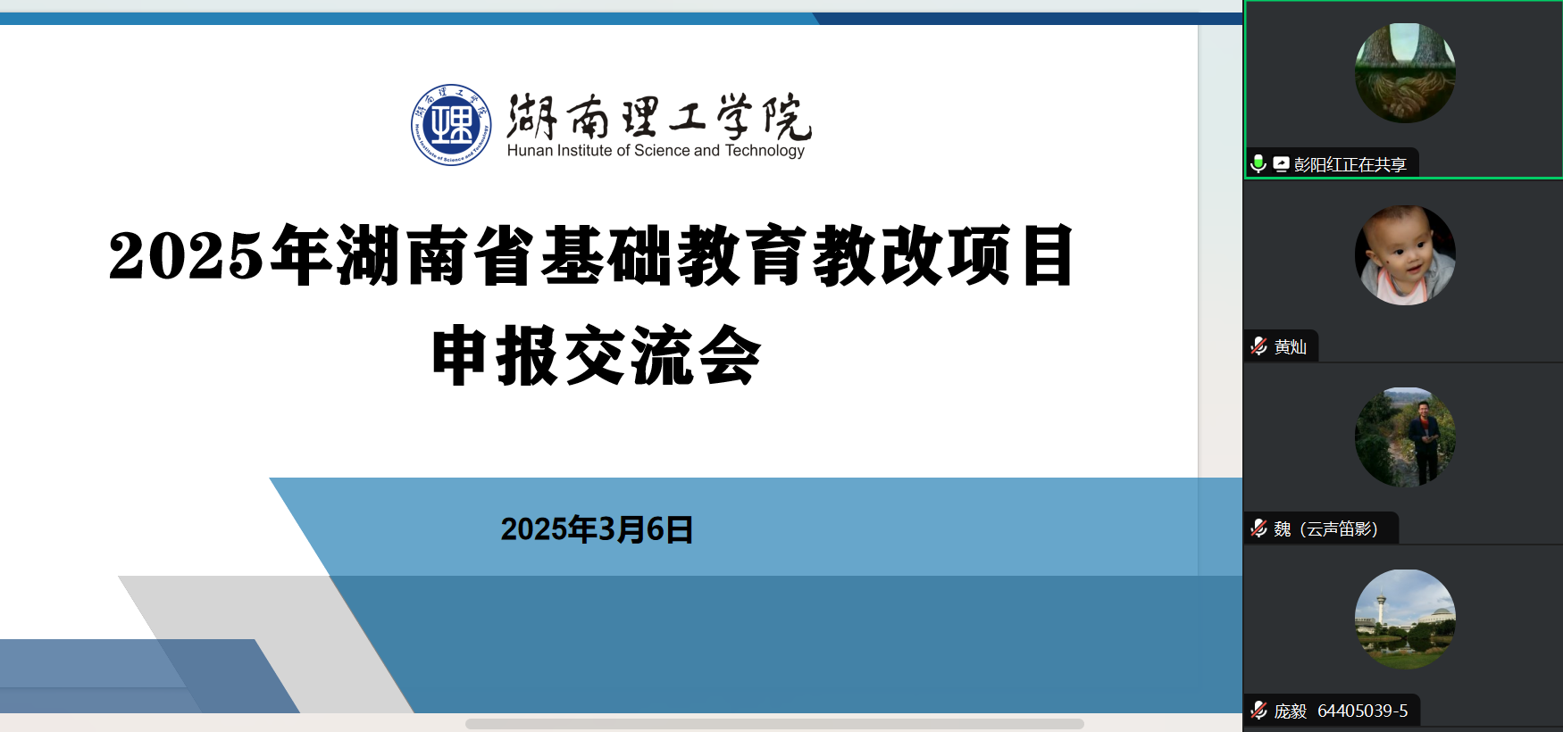 2025年3月6日,beats365官方网站通过腾讯会议平台组织召开了2025年湖南省基础教育教改项目申报交流会。会议由beats365官方网站主持工作的副经理彭阳红主持,拟推荐参评2025年湖南省基础教育教改项目的主持人参加会议。