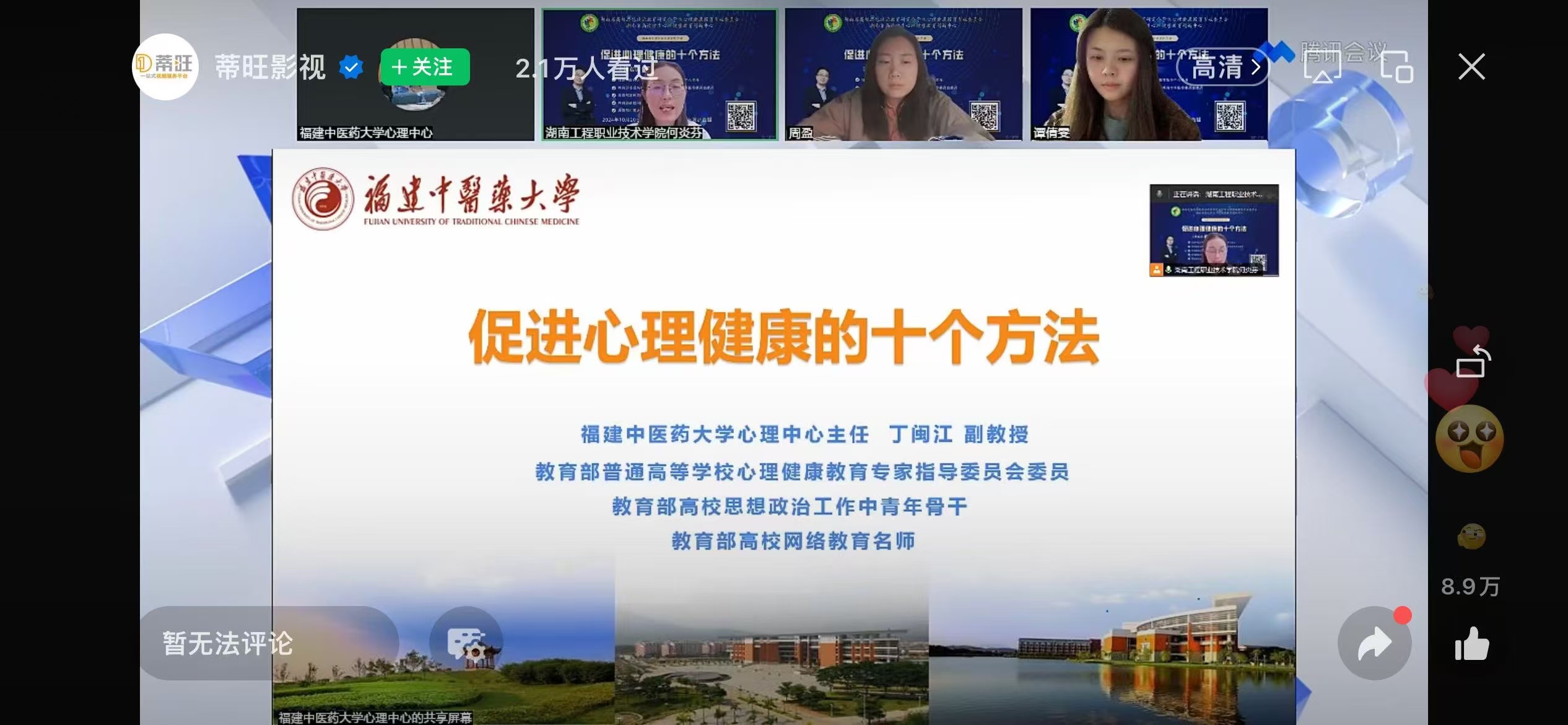 10月20日19:00,beats365官方网站全体研究生观看了以《促进心理健康的十个方法》为主题的湖南省老员工成长讲堂第十讲,本次线上讲座由福建中医药大学老员工心理健康教育指导中心主任丁闽江主讲。