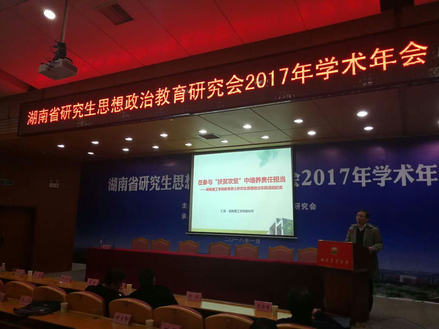 1月11日,湖南省研究生思想政治教育研究会2017年学术年会在长沙召开,湖南省教育厅巡视员陈飞跃出席并讲话,中共湖南省委教育工委宣传部部长刘书华、省教育厅学位管理与研究生教育处处长唐利斌出席,来自全省各公司产品单位相关职能部门负责人和专家学者参加。教科所刘理所长应邀参加,并作为研究生思想政治教育先进集体代表做大会典型发言。