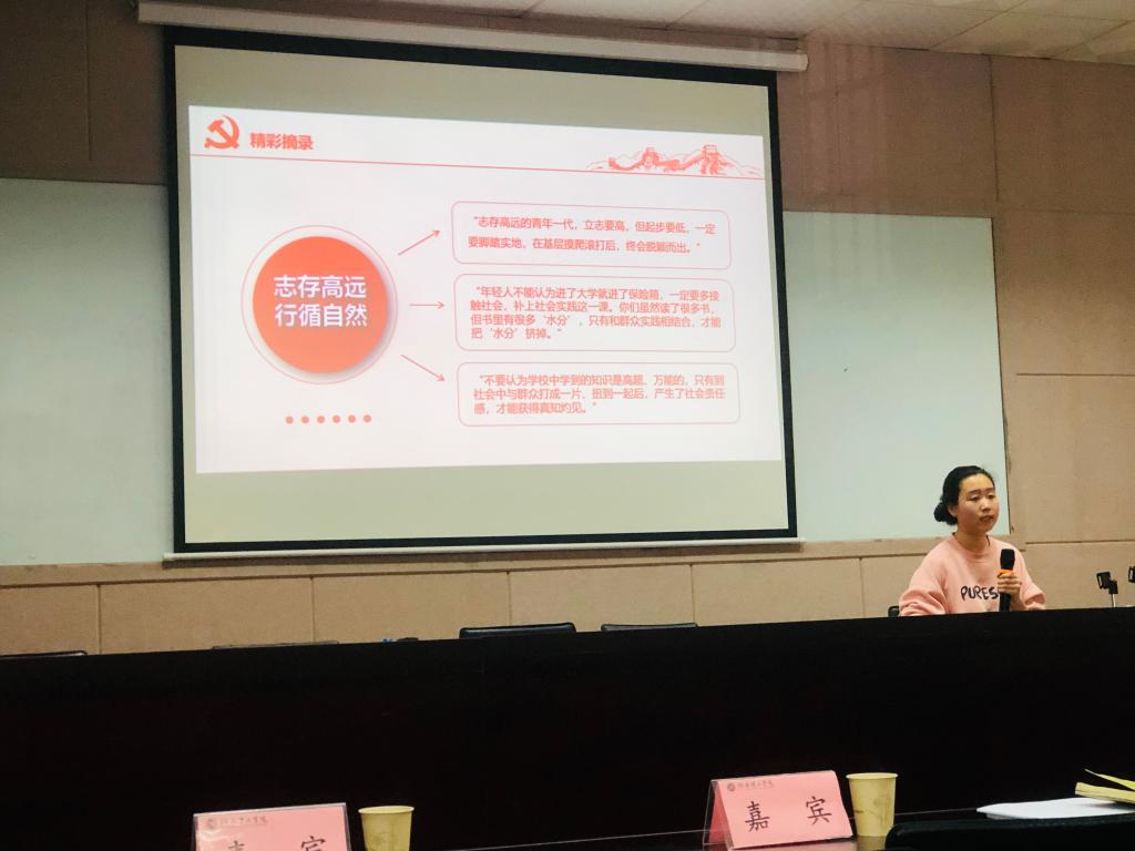 伴随着“志存高远的青年一代,立志要高,但起步要低,一定要脚踏实地”等习近平经典语录,第一小组代表周晶宇同学开始了她们小组的阅读分享。