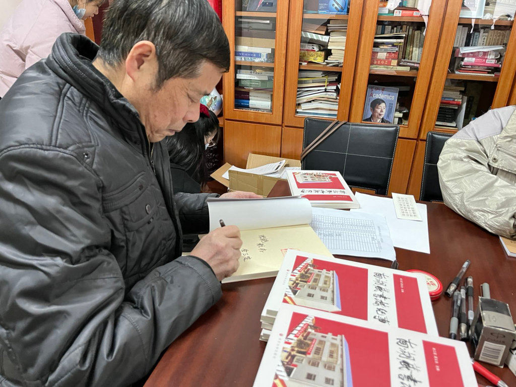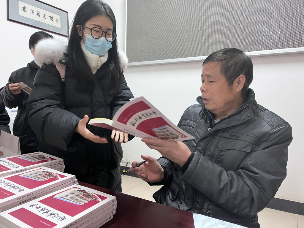 参观结束后,余三定亲笔题名,赠予同学们《南湖藏书楼纪事》一书。随后大家围坐在一起,认真聆听着余三定从“藏书”谈到“读书”。他历数中国私家藏书的优良传统以及岳阳盛行的藏书氛围,着重介绍了南湖藏书楼的四大功能:藏书、读书、谈书、举行小型研讨会,并通过一个个颇为有趣的小故事告诉大家“家有藏书赶快读”和“借书要还”的道理。他始终认为读书是快乐的,而目的的快乐和过程的快乐也是可以有机统一的。讲座最后,他送给同学们几点宝贵的读书建议:第一就是要有自主性,有战略眼光,不要跟着时尚跑,不要跟着畅销书跑,不要跟着出版商的炒作跑。第二就是要选读好书,要选择那些有档次、有水平的书来读,多读非专业的书。最后一点是要理论联系实际,要将所读、所学运用于实践,在阅读的同时要动笔。此次书香之旅结束后,同学们纷纷被激起了更加强烈的读书欲望,都表示,要像余老师那样,以读书为乐,快乐读书。(撰稿:李娟,摄影:刘媛;一审:邓怡、黄灿;二审:王炜;三审:刘淳松)