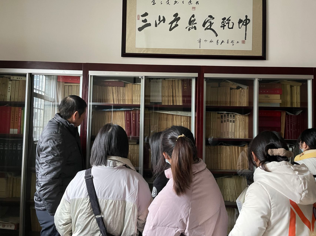 在讲座开始之前,余三定带领同学们参观了他的私家藏书楼——南湖藏书楼。南湖藏书楼建成于2006年11月底,建筑面积960平方米,共藏书六万多册,多为文、史、哲方面的学术著作,书籍多到让同学们叹为观止。在浓郁书香的包围下,在余三定生动形象的介绍中,同学们参观了每一间藏书室。其中最具特色的有两间,一是题签本珍藏室,收藏著者赠送的题签本;二为北大版典藏室,收藏北京大学出版社出版的学术著作。余三定说藏书要“六防”:防火、防盗、防潮、防虫、防紫外线、防尘,可见藏书之不易。
