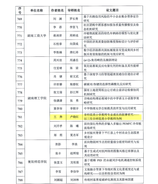 近日,湖南省教育厅公布了2024年湖南省优秀博士硕士学位论文评选结果,公司2022届小学教育专业硕士研究生王奔的学位论文《非师范类小学教师专业成长的叙事研究——以三位非师范类小学教师为例》(指导老师:卢晓红),荣获2024年湖南省优秀硕士学位论文。