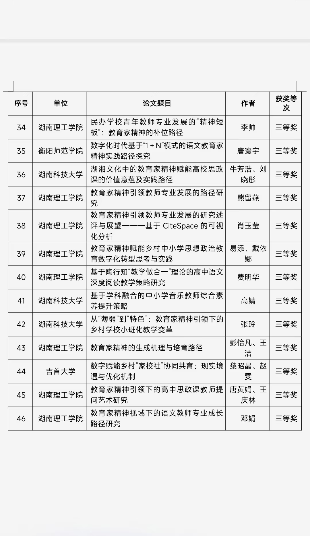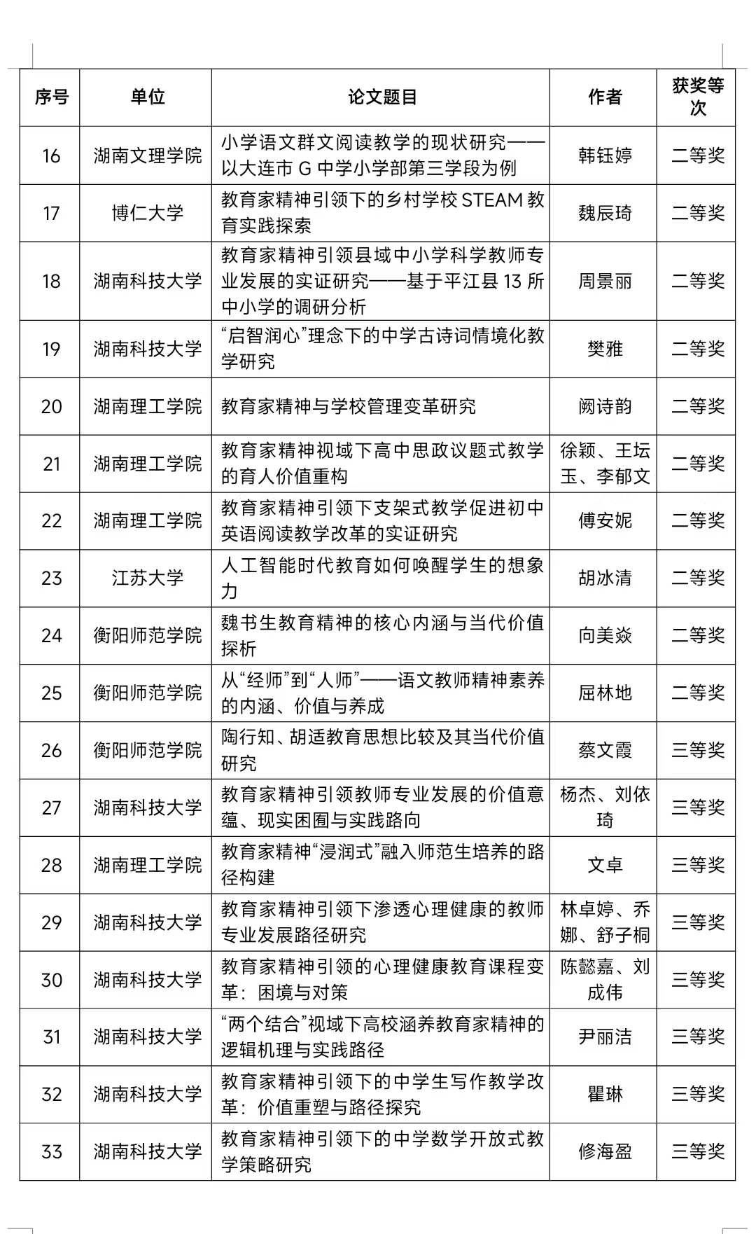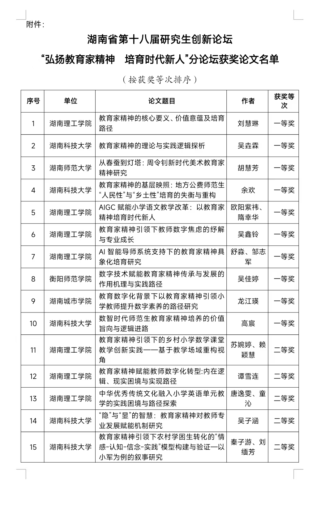 经湖南省教育厅批准,湖南省第十八届研究生创新论坛“弘扬教育家精神 培育时代新人”分论坛定于2025年11月22日在湖南理工公司举办。本论坛于2025年6月起面向省内外高校、科研院所在读研究生征集高水平学术论文,得到了各单位的积极参与。本次征文共收到稿件156篇,经专家评审,共评定获奖论文46篇,其中一等奖10篇,二等奖15篇,三等奖21篇,详细名单见附件。