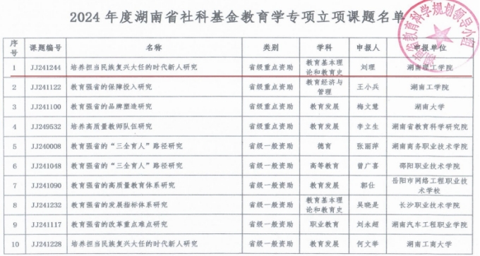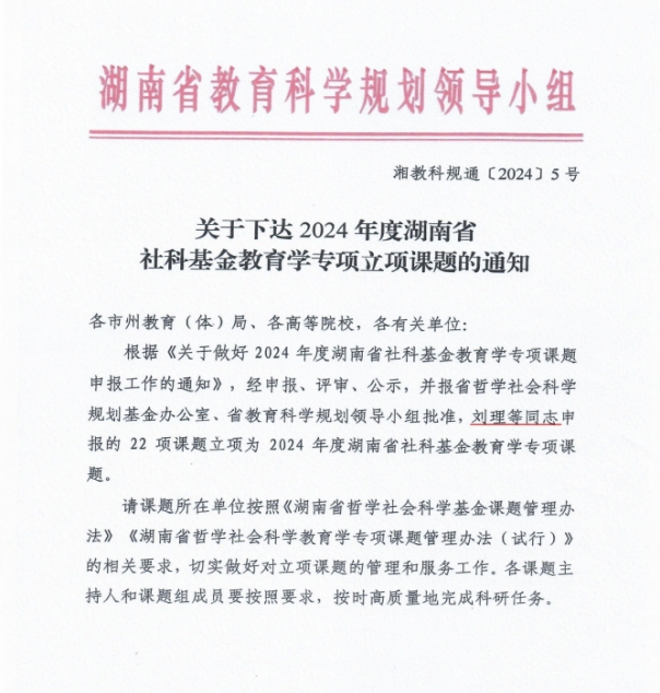 近日,2024年度湖南省社科基金教育学专项课题评审结果公布,经湖南省哲学社会规划办和湖南省教育科学规划领导小组批准,公司刘理教授申报的项目《培养担当民族复兴大任的时代新人研究》获重点立项资助。
